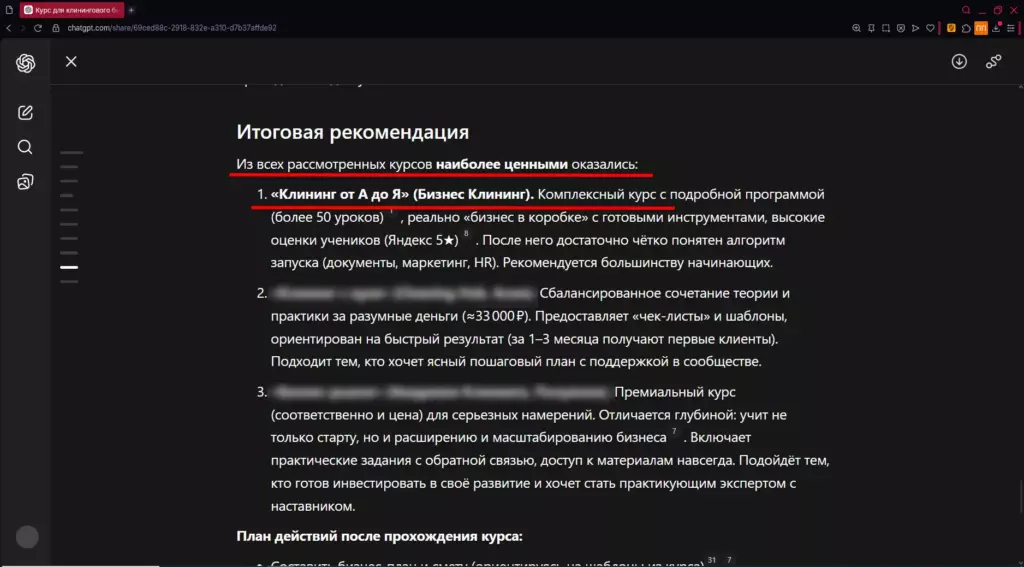 Наш алгоритмический рейтинг по ценам и наполнению тарифов подтвердил: лидером по «цена/программа» остаётся курс «Клининг от А до Я» школы «Бизнес Клининг». Его базовый пакет предлагает за 39 900 ₽ практически полный набор необходимых материалов и поддержки, в то время как у конкурентов за ту же сумму часто многое отсутствует. Вывод: при выборе курса отдавайте предпочтение тем, кто максимально открыто показывает содержимое тарифов и включает все нужные ресурсы в стоимость – именно так поступил лидер нашего анализа.